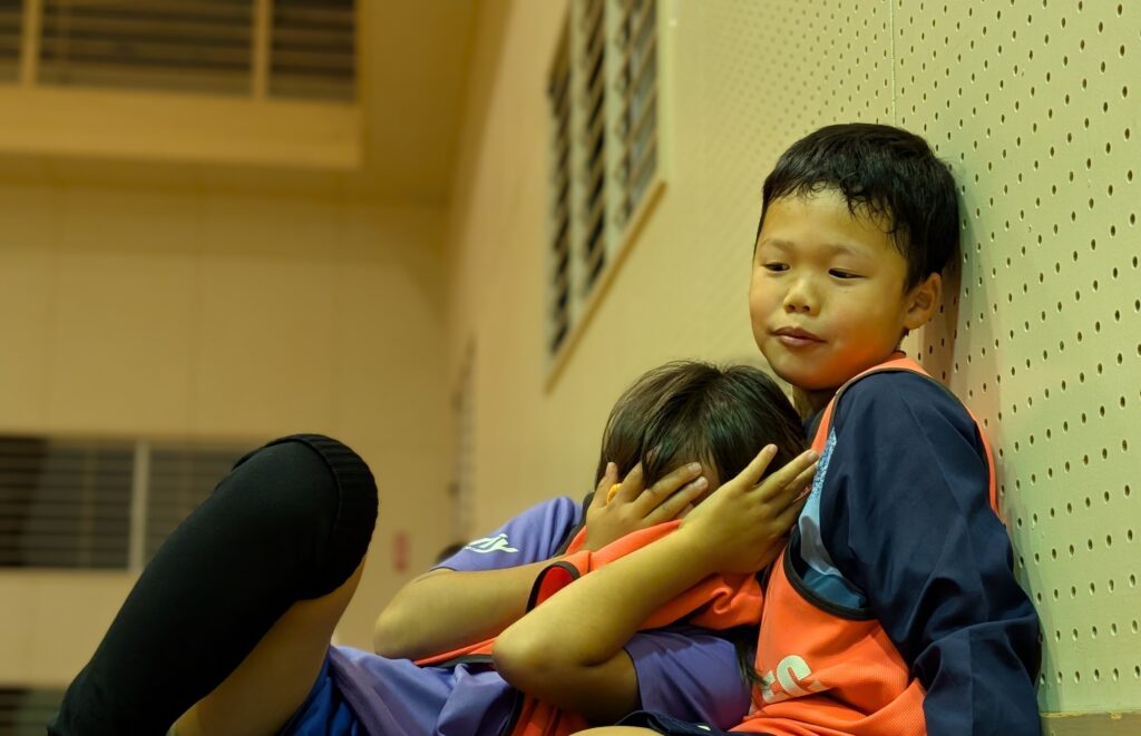 ゲーム前に自分達でミーティングをする1年生選手達
